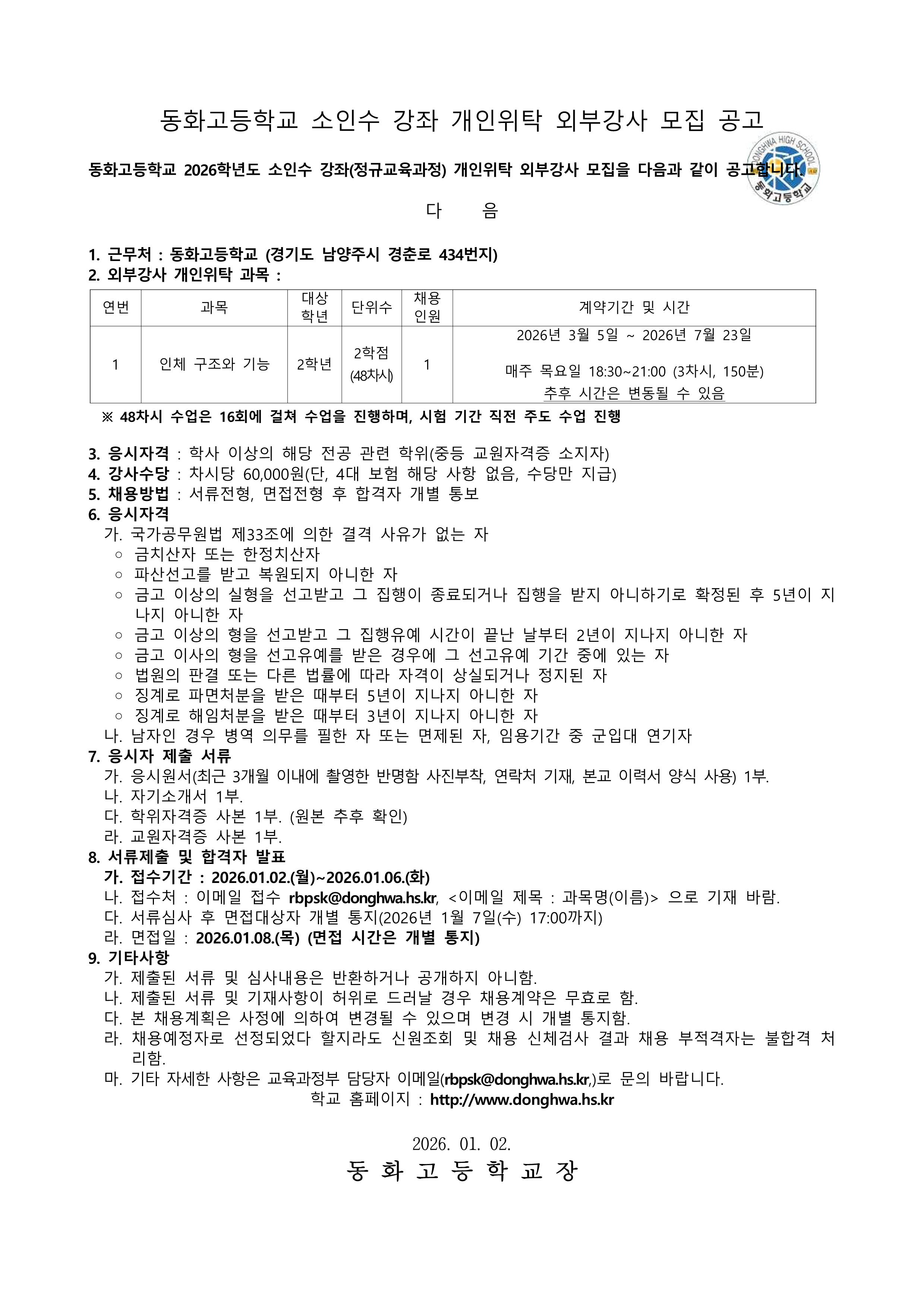 2026학년도 동화고등학교 소인수 강좌 개인위탁 외부강사 모집 공고(2차, 인체 구조와 기능)