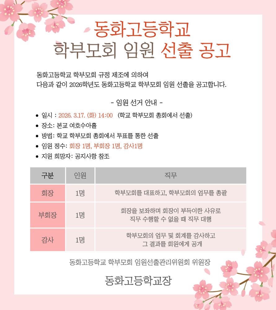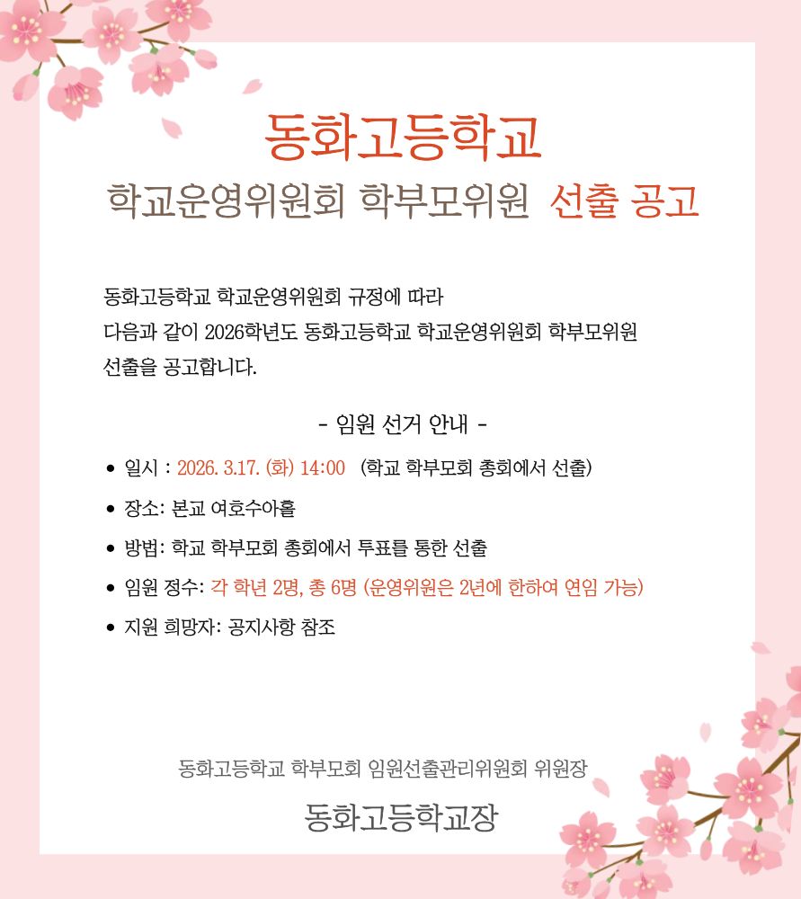 [공지] 2026학년도 동화고 학부모회 임원, 학교운영위원회 학부모위원 선출 공고