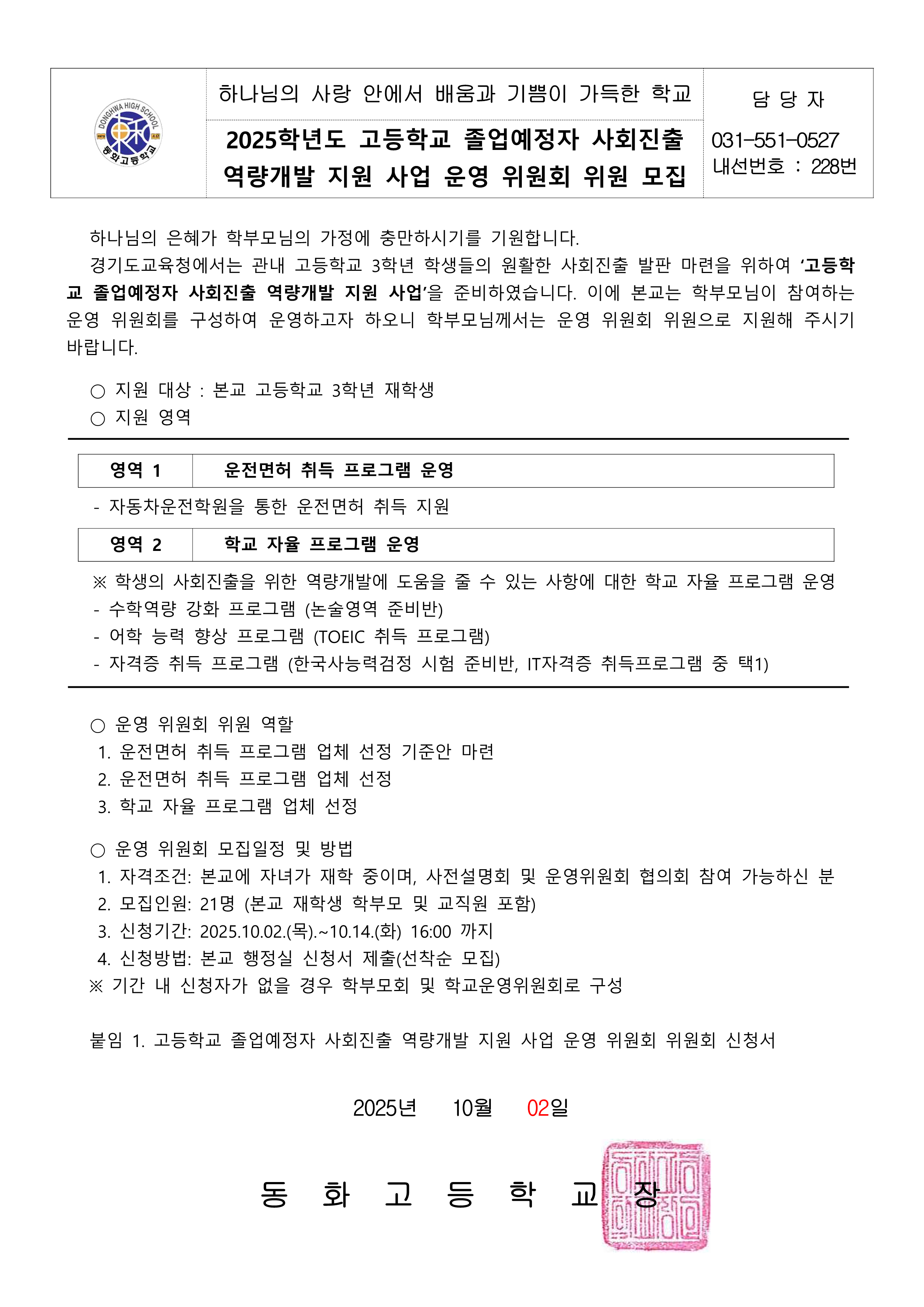 2025학년도 고등학교 졸업예정자 사회진출 역량개발 지원 사업 운영위원회 모집안내