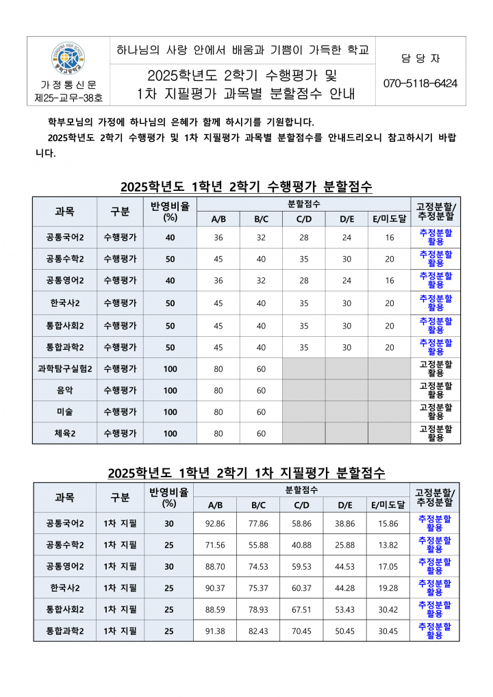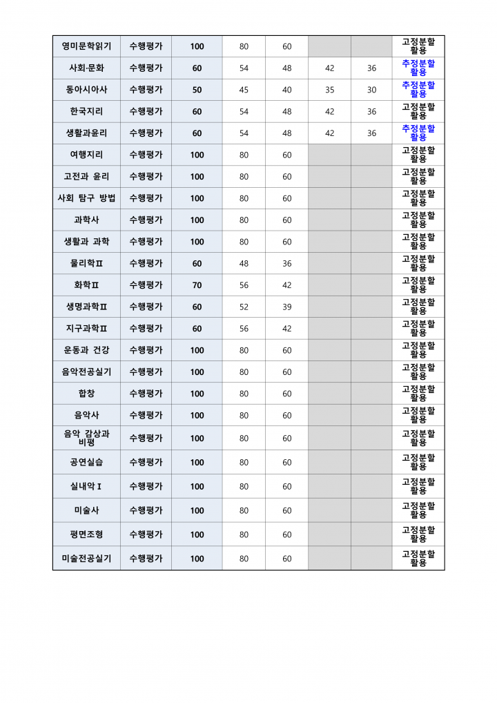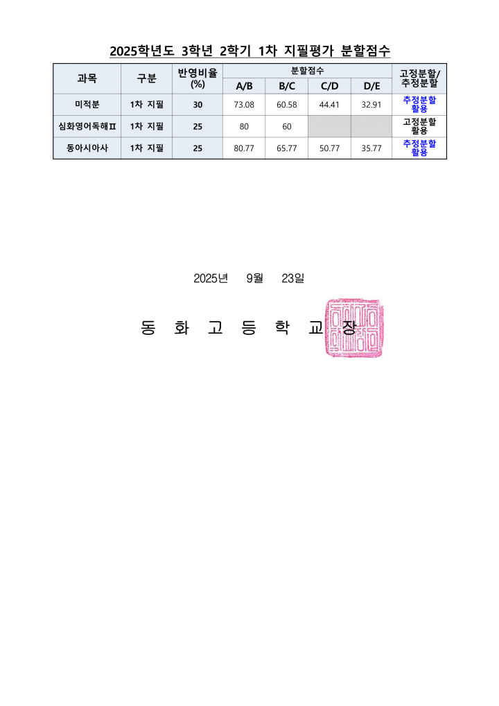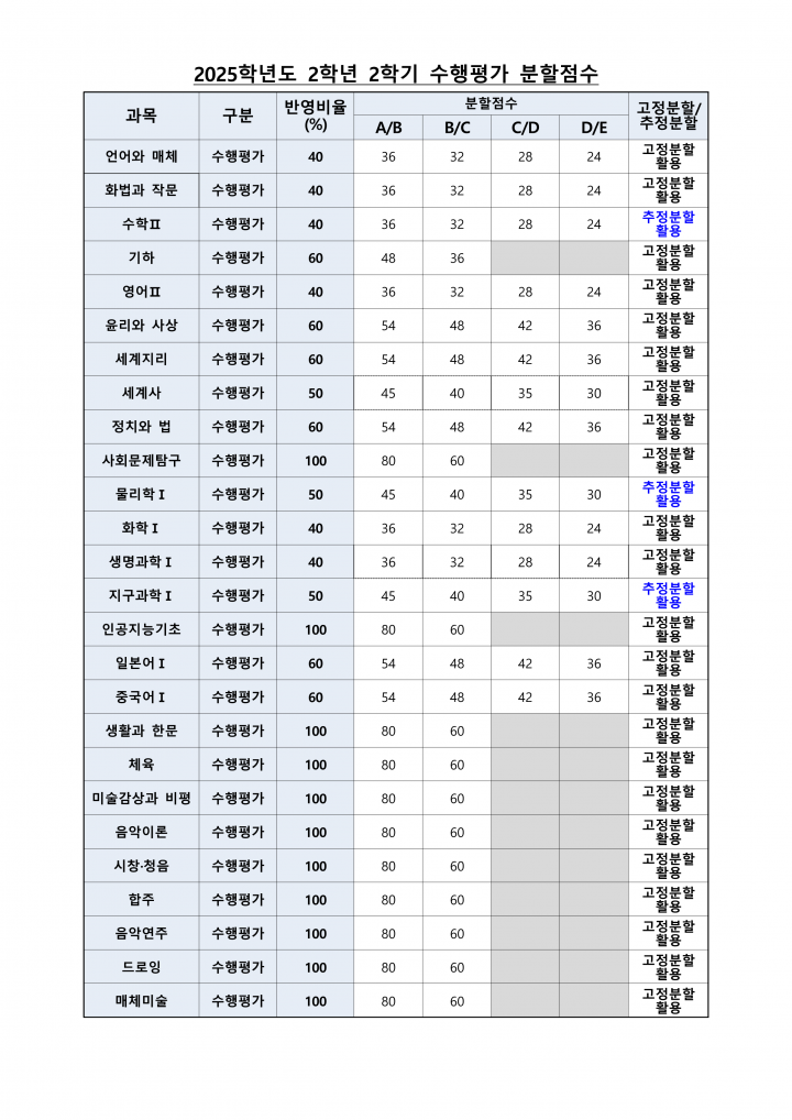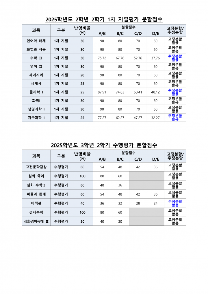 [교무부] 2025학년도 2학기 수행평가 및 1차 지필평가 과목별 분할점수