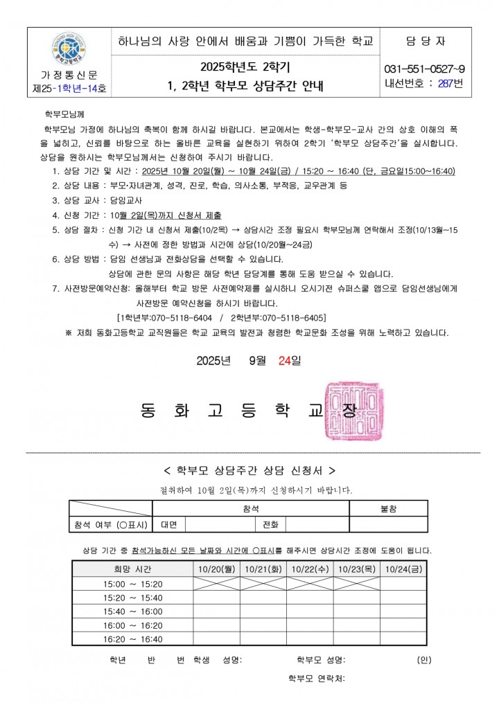 2025학년도 2학기 1,2학년 학부모 상담주간 안내(가정통신문)