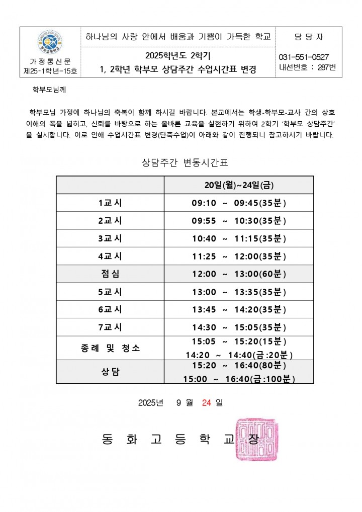 2025학년도 2학기 1,2학년 학부모 상담주간 수업시간표 변경 가정통신문입니다.