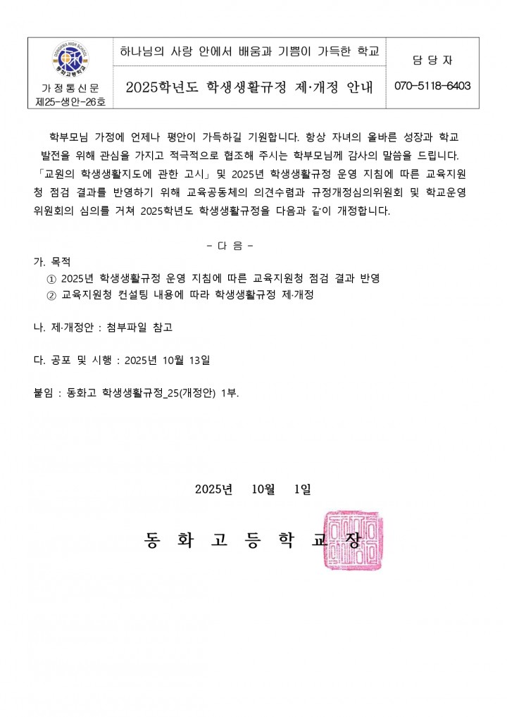 [가정통신문]2025학년도 학생생활규정 제·개정 안내