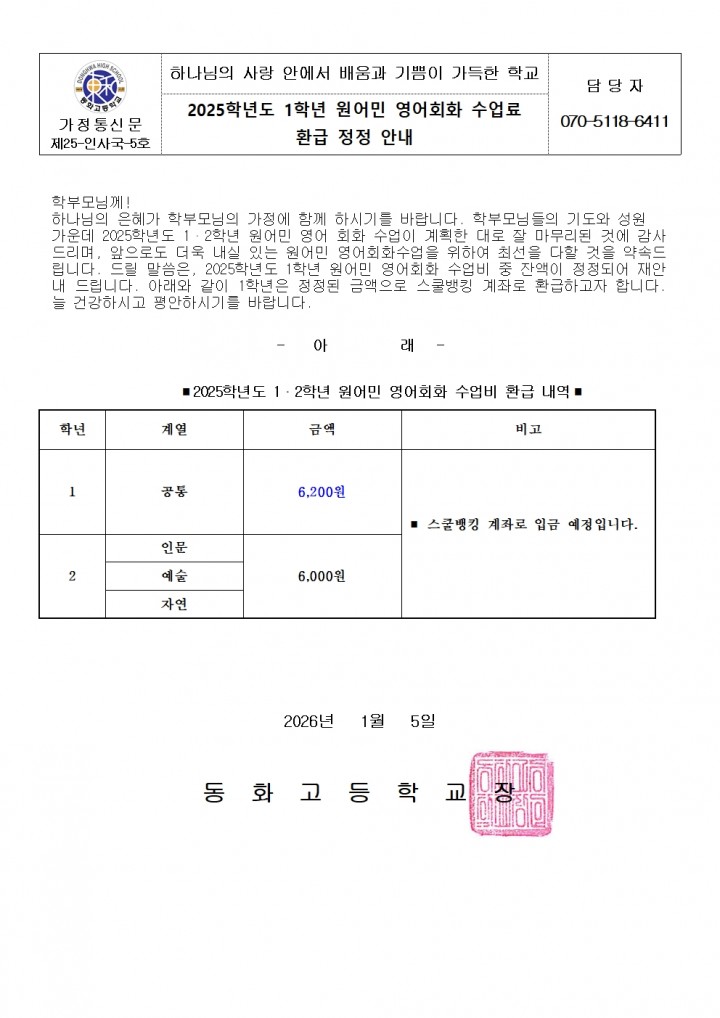 [인사국부]2025학년도 1학년 원어민 영어회화 수업료 환급 정정 안내