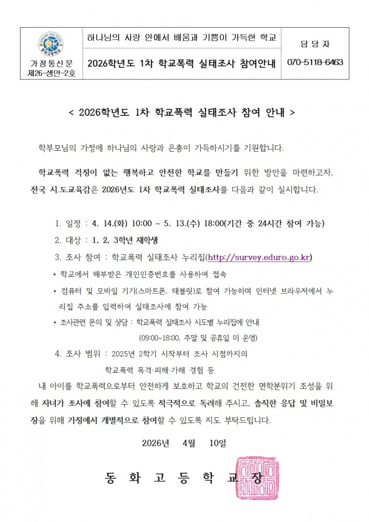 [생안부] 2026학년도 1차 학교폭력 실태조사 참여안내