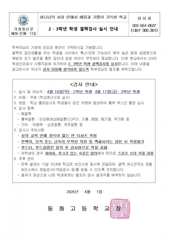 2026학년도 2,3학년 학생 결핵검사 실시 안내