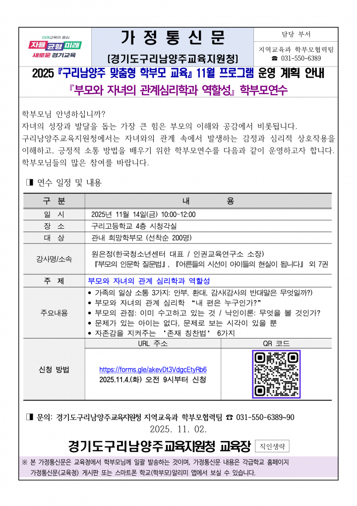 [구리남양주교육지원청] 2025 권역으로 찾아가는 맞춤형 학부모교육 11월 프로그램 운영 안내