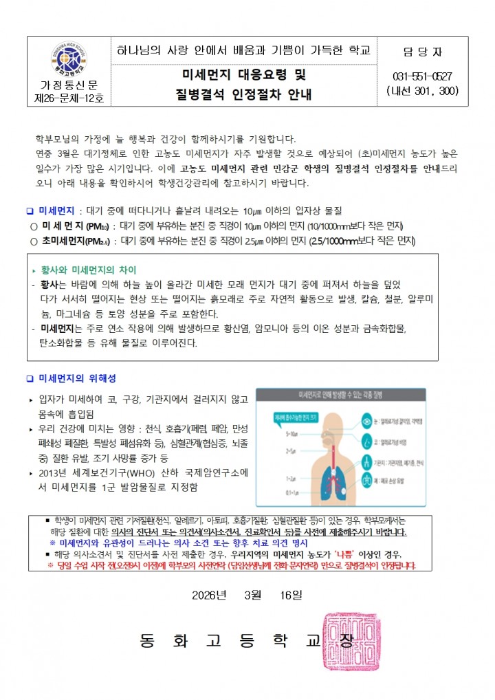 [보건실] 미세먼지 대응요령 및 질병결석 인정절차 안내
