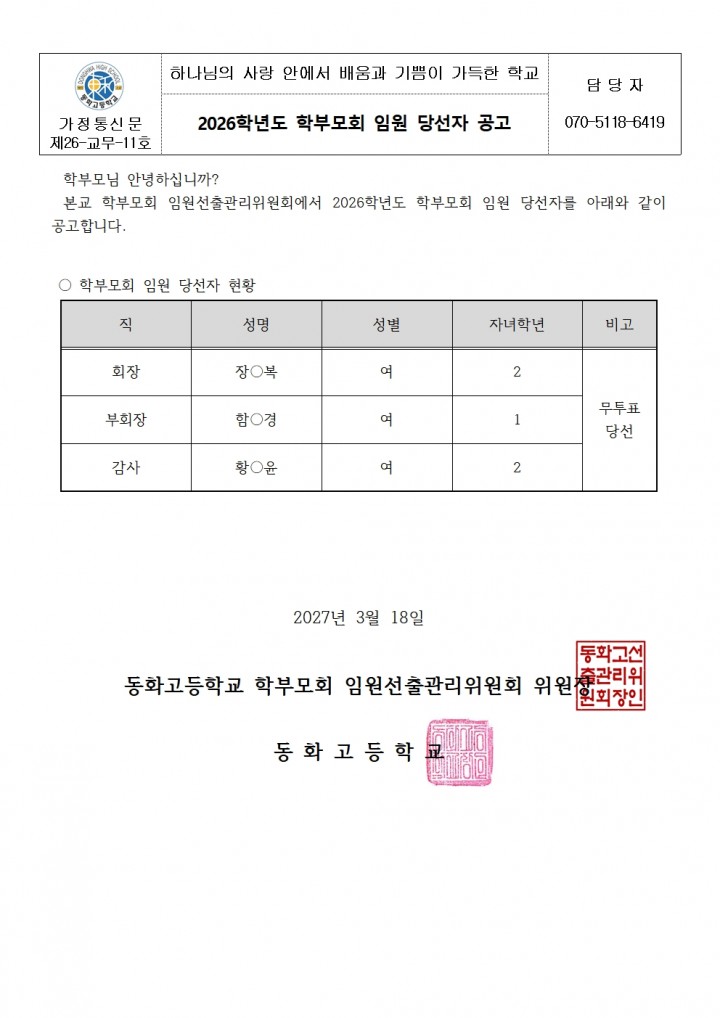 [교무부]2026학년도 학부모회 임원 당선자 공고