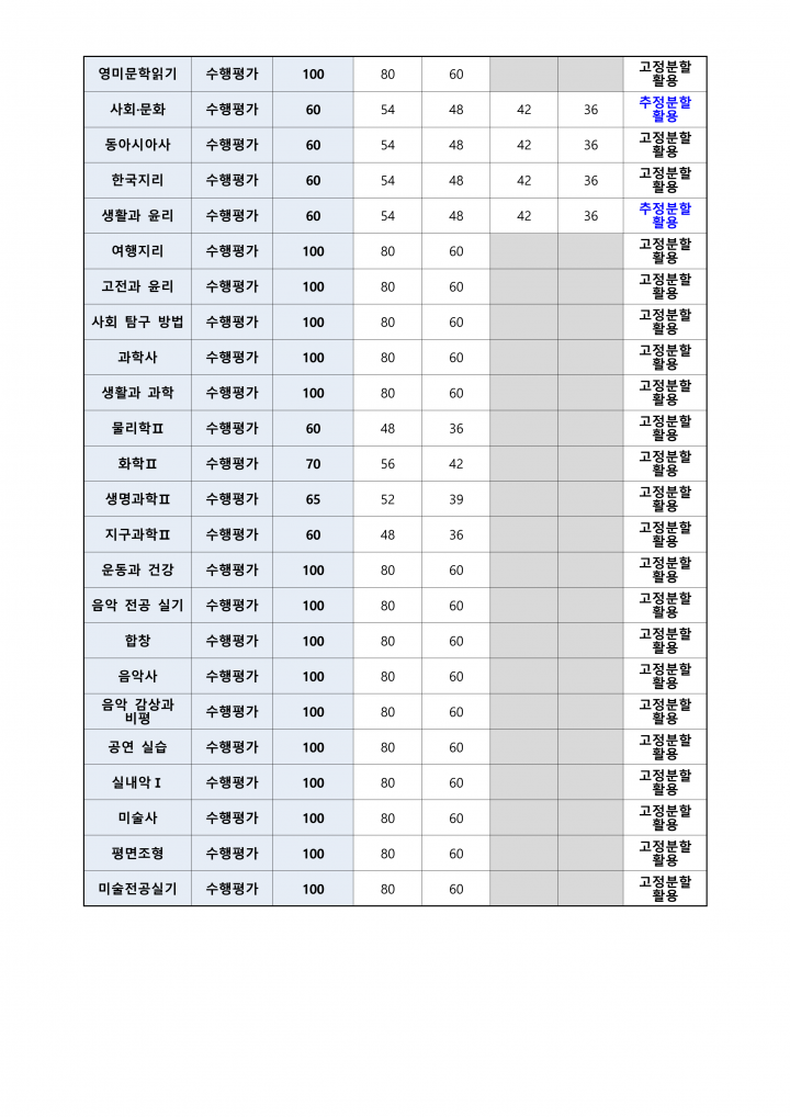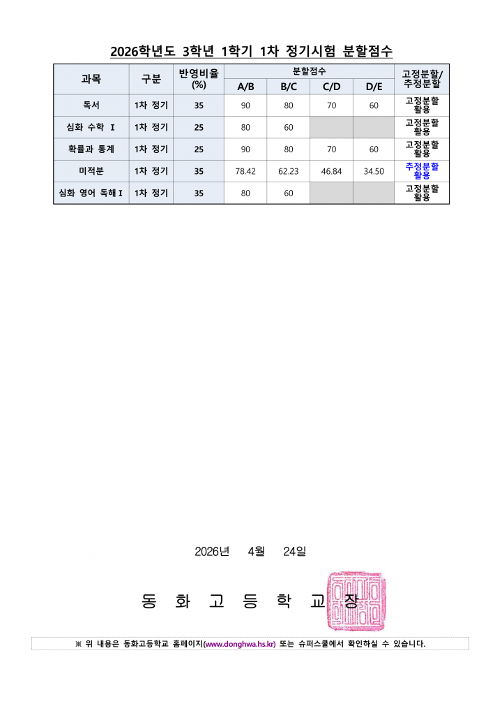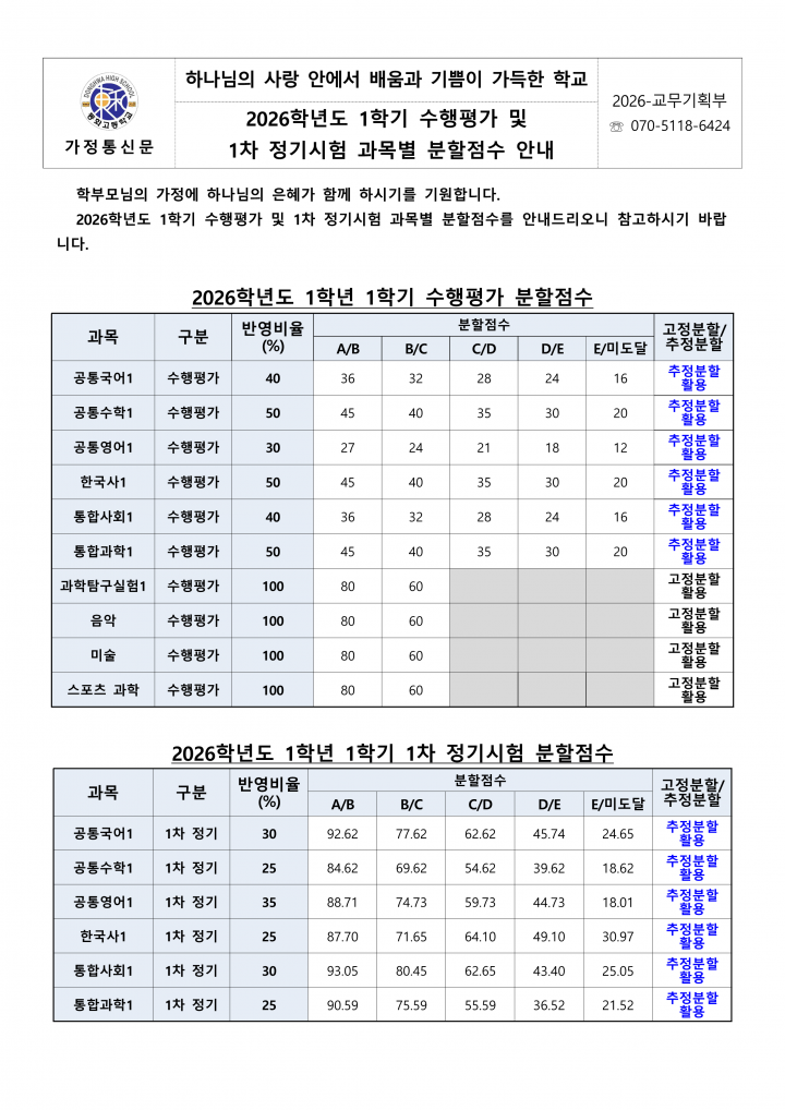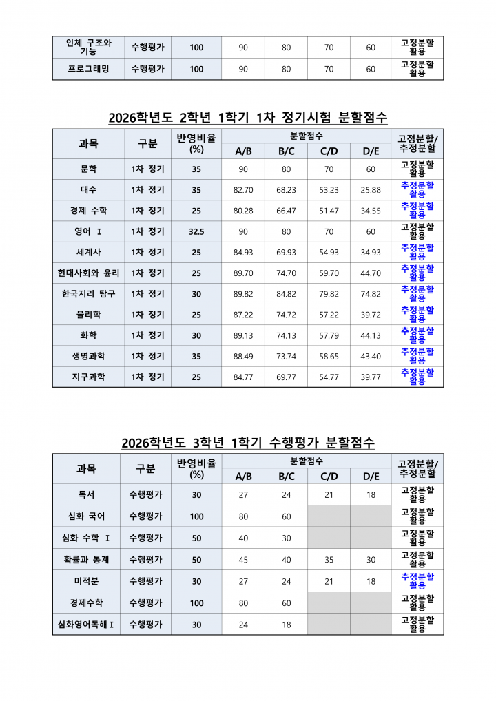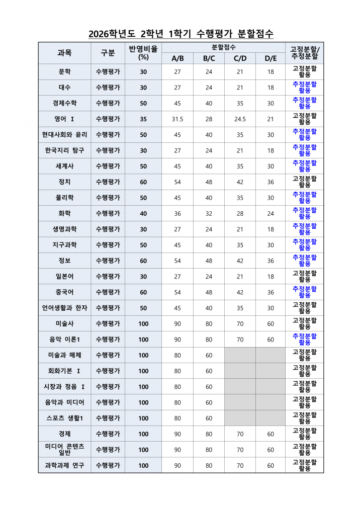 2026학년도 1학기 수행평가 및 1차 정기시험 과목별 분할점수