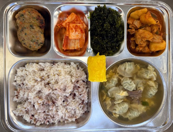 흑미기장밥, 물만둣국(염도0.6), 순살닭볶음탕, 동그랑땡전, 김자반, 포기김치, 파인애플