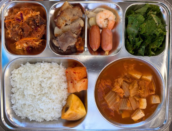 칼슘찹쌀밥, 김치찌개(염도0.7), 캠핑모듬구이, 실곤약골뱅이무침, 상추겉절이, 깍두기, 단감