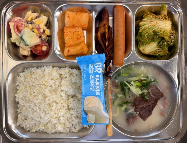 기장밥, 한우설렁탕(염도0.7), 소세지구이, 낙지호롱, 과일샐러드, 봄동겉절이, 석박지, 아이스크림