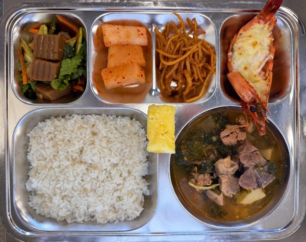 현미찹쌀밥, 순살감자탕(염도0.7), 치즈새우, 도토리묵채소무침, 진미채볶음, 석박지, 파인애플