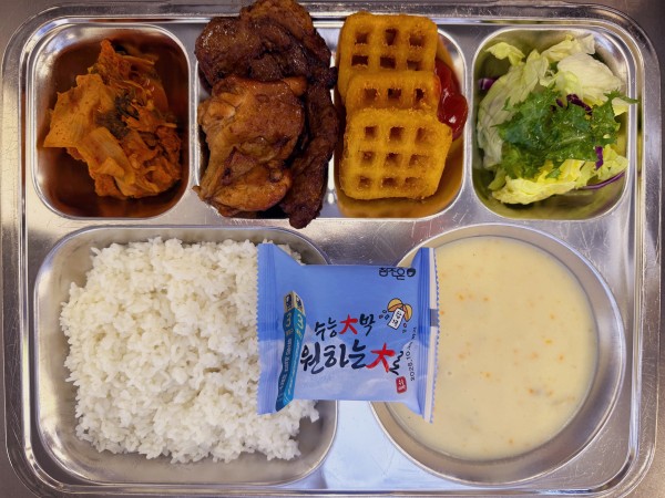 칼슘찹쌀밥, 치킨&목살스테이크, 와플감자튀김, 양상추샐러드, 김치볶음, 요거꿀떡