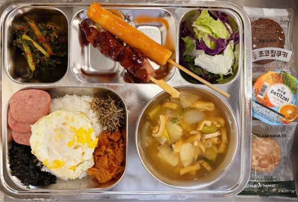 칼슘찹쌀밥, 유부장국(염도0.7), 햄구이, 멸치볶음, 김치볶음, 달걀후라이, 닭꼬치&떡꼬치, 열무김치, 양상추샐러드 골라먹는 후식