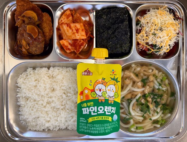 칼슘찹쌀밥, 우동국(염도0.6), 돈까스.함박정식, 토마토치즈샐러드, 구이김, 포기김치, 파인오렌지주스