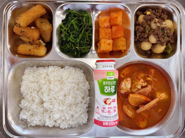 칼슘찹쌀밥, 부대찌개(염도0.8), 메추리알쇠고기조림, 고구마추러스맛탕, 비름나물, 깍두기, 유산균요구르트