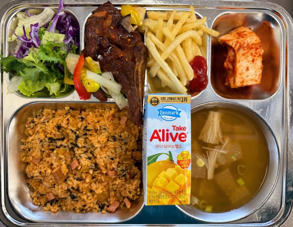 깍두기볶음밥, 무팽이된장국(염도0.6), 양갈비구이&구운채소, 감자튀김, 양상추유자샐러드, 포기김치, 얼라이브