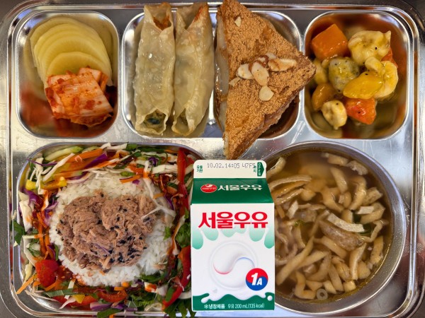 참치채소비빔밥, 유부우동국물(염도0.6), 통새우만두, 인절미토스트, 열대과일샐러드, 단무지.포기김치, 우유