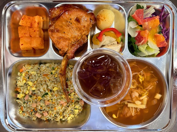 후리카케밥, 김치콩나물국(염도0.6), 돈마호크, 구운채소, 자몽샐러드, 깍두기, 레몬아이스티