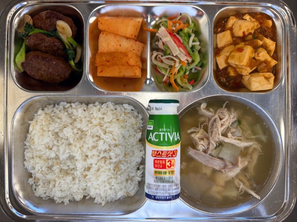 현미찹쌀밥, 닭곰탕(염도0.7), 떡갈비청경채조림, 마파두부, 오이맛살겨자무침, 석박지, 유산균요구르트