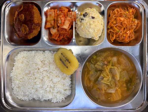 칼슘찹쌀밥, 배추된장국(염도0.7), 치즈돈까스, 비빔쫄면, 에그마요샐러드, 포기김치, 골드키위