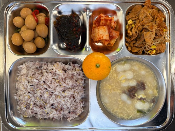 흑미기장밥, 조랭이떡국(염도0.6), 콩나물불고기, 메추리알조림, 깻잎지, 포기김치, 귤