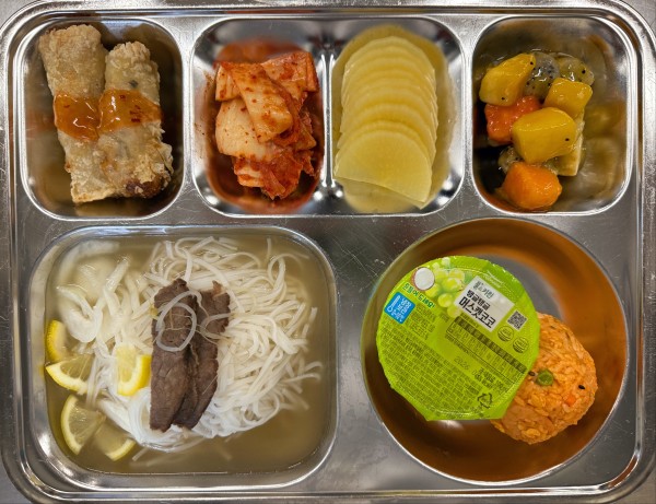 쌀국수(염도0.8), 나시고랭볶음밥(추가), 짜조, 열대과일샐러드, 단무지.포기김치, 머스캣코코