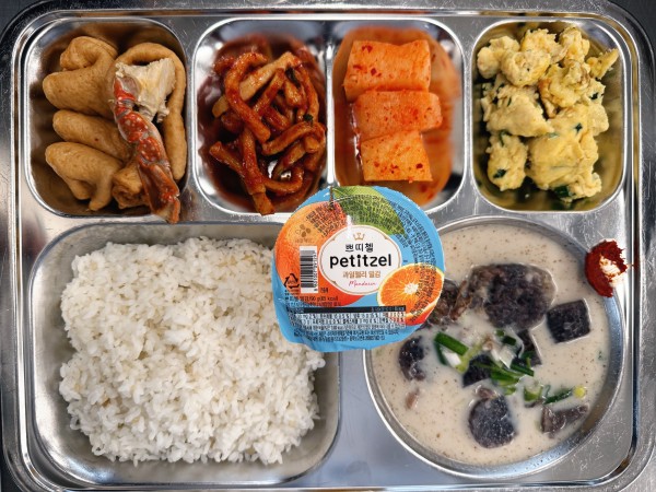 현미찹쌀밥, 순댓국(염도0.7), 매운어묵꼬치, 스크램블에그, 무말랭이무침, 석박지, 쁘띠첼