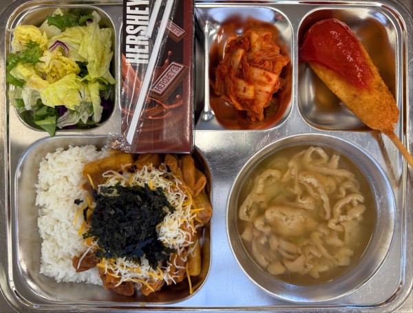지코바치밥, 유부우동국물(염도0.6), 치즈핫도그, 양상추샐러드, 포기김치, 허쉬드링크