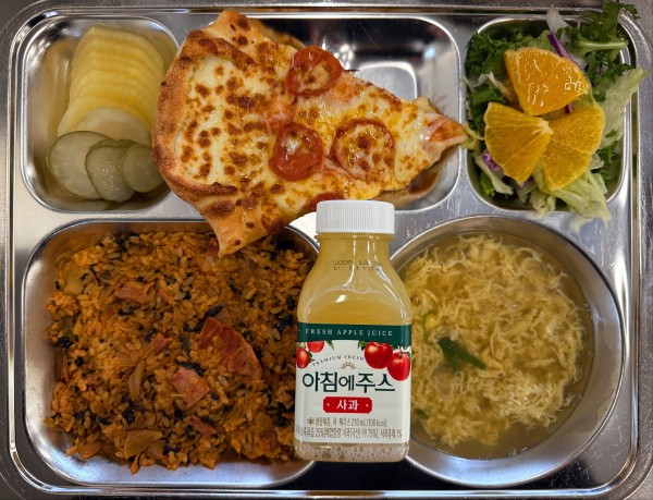 베이컨김치볶음밥, 달걀파국(염도0.6), 즉석피자, 오렌지샐러드, 단무지.피클, 아침에주스
