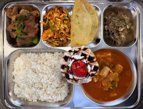 발아현미밥, 두부김치찌개(염도0.7), 목살데리야끼조림, 비빔채소.납작만두, 멸치아몬드조림, 총각김치, 생크림와플