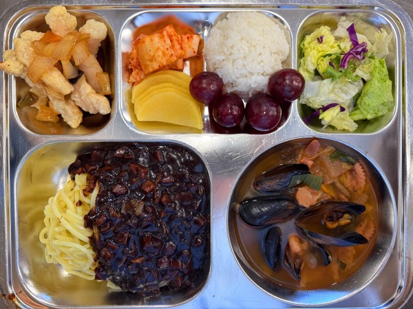 자장면, 짬뽕국물(염도0.7), 추가밥, 탕수육.소스, 양성추샐러드, 단무지.포기김치, 포도