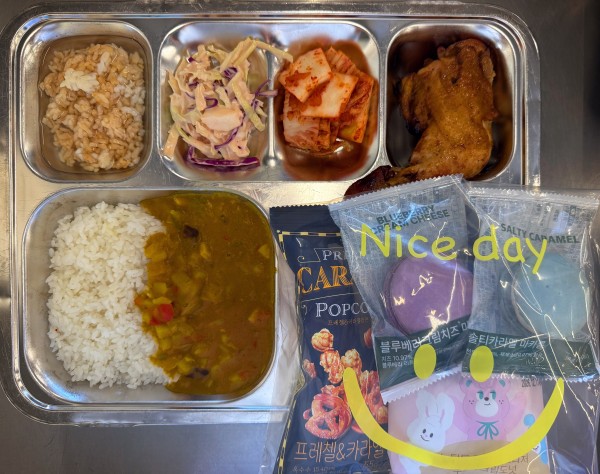 카레라이스, 닭다리구이, 양배추샐러드, 포기김치, 방학잘보내후식