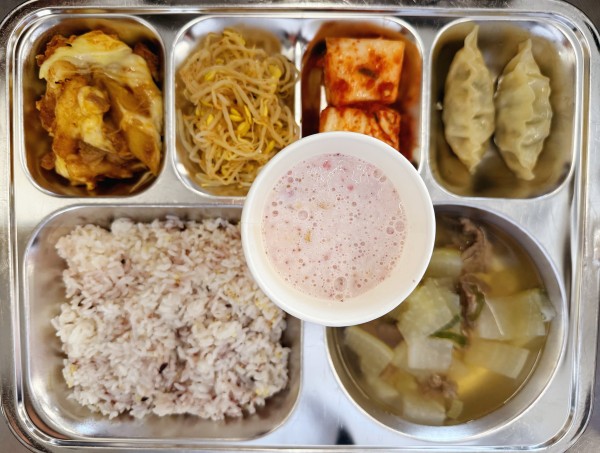 흑미기장밥, 쇠고기무국(염도0.6), 치즈불닭, 교자만두찜, 콩나물무침, 포기김치, 딸기쉐이크
