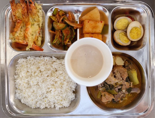 기장밥, 순살감자탕(염도0.8), 치즈새우, 달걀조림, 오이양파무침, 석박지, 미숫가루