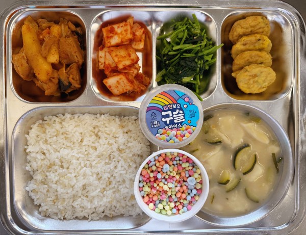 현미찹쌀밥, 수제비국(염도0.6), 닭갈비, 동그랑땡구이, 참나물무침, 포기김치, 구슬아이스크림