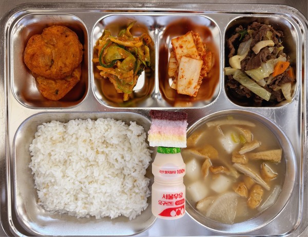 발아현미밥, 물떡어묵국(염도0.6), 한우불고기, 김치전, 도라지오이생채, 포기김치, 무지개떡.요구르트