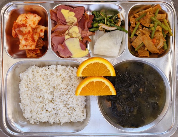 차조밥, 쇠고기미역국(염도0.5), 오리훈제.무쌈, 마늘쫑 어묵볶음, 부추무침, 포기김치, 오렌지
