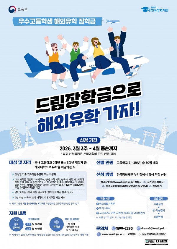 1. 한국장학재단은 저소득층우수고등학생 대상으로 해외유학을 지원하는‘우수고등학생 해외유학 장학금(이하, 드림장학금)’사업을 운영하고 있습니다.